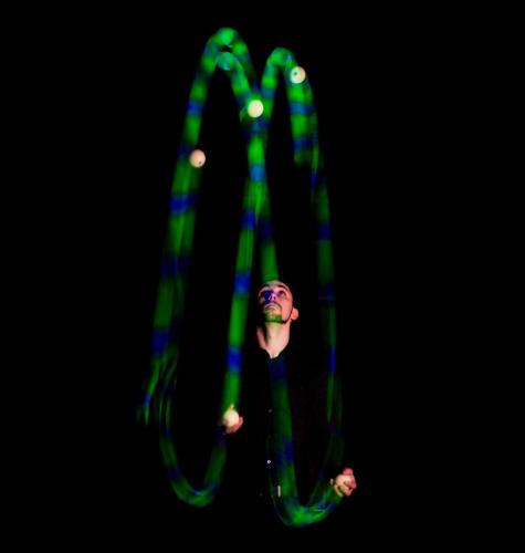 Jongliertricks mit bis zu fünf leuchtenden Bällen bilden eindrucksvolle Muster & verblüffende Jongliereffekte